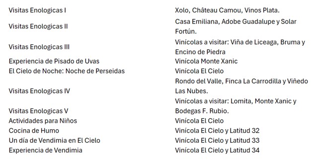 El calendario 2025 va más allá de estos clásicos y ofrece una programación reforzada con más de 40 actividades del vino mexicano. Entre ellas destacan cenas maridaje con chefs de prestigio internacional, catas dirigidas por sommeliers expertos, recorridos guiados por viñedos, experiencias gastronómicas, conciertos, arte y mucho más.